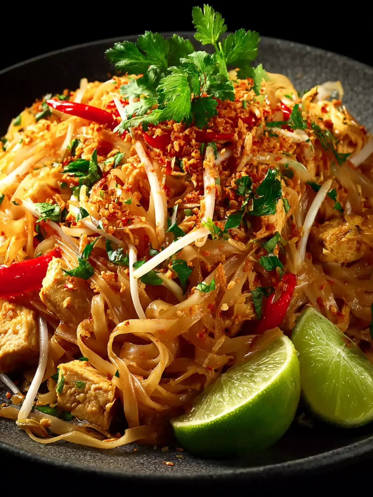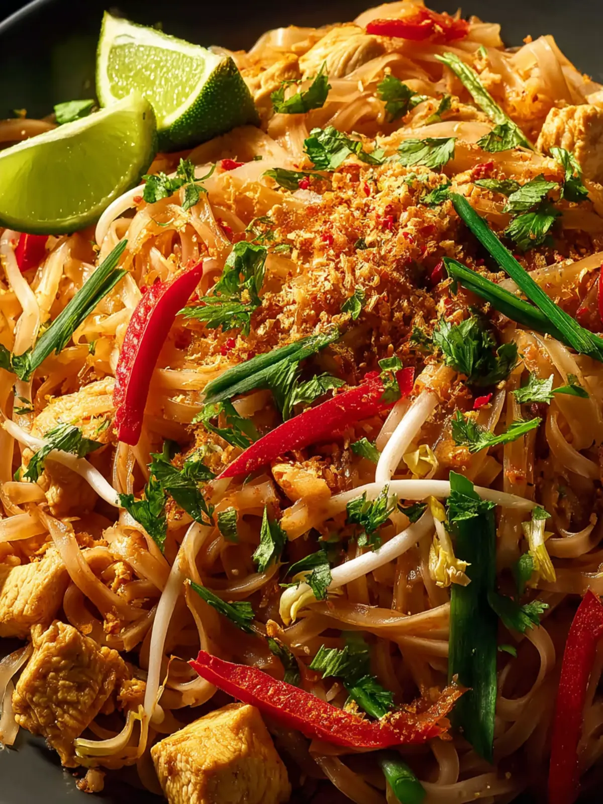 A delicious homemade Pad Thai recipe with chicken, rice noodles, and a flavorful sauce.