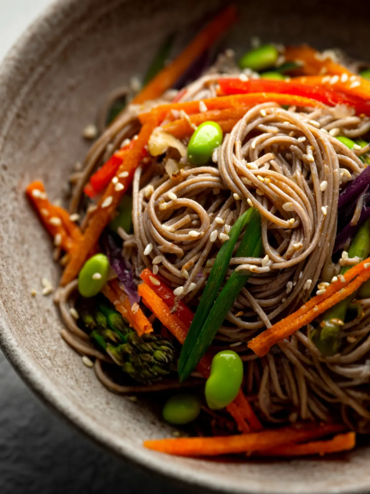 A refreshing soba noodle salad with a flavorful miso dressing and crunchy vegetables.
