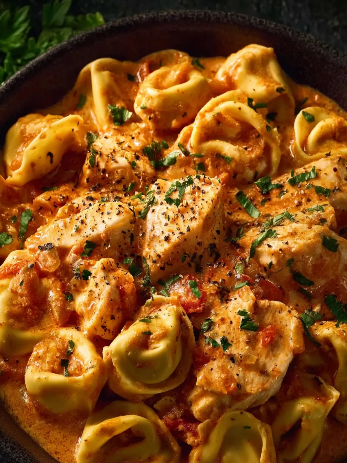 - Once the tortellini is cooked and everything is creamy and heated through, give the dish one final stir. Serve warm with a sprinkle of fresh parsley on top if you’d like a pop of color and freshness.