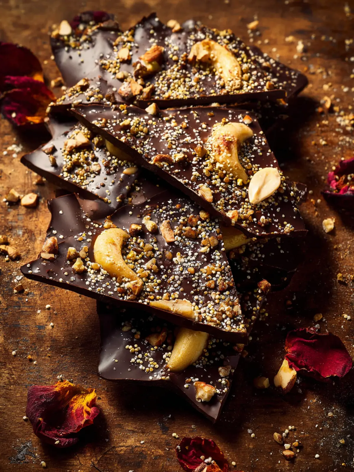 A delicious chocolate bark made with quinoa, pistachios, and bananas, perfect for a sweet treat or snack.