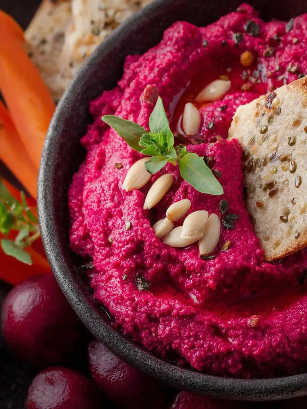 Packed with benefits, beetroot is a nutritional powerhouse, known for its high levels of antioxidants and vitamins. This delicious dip is rich in fiber, which supports digestion, and contains nitrates that have been shown to boost athletic performance and lower blood pressure.