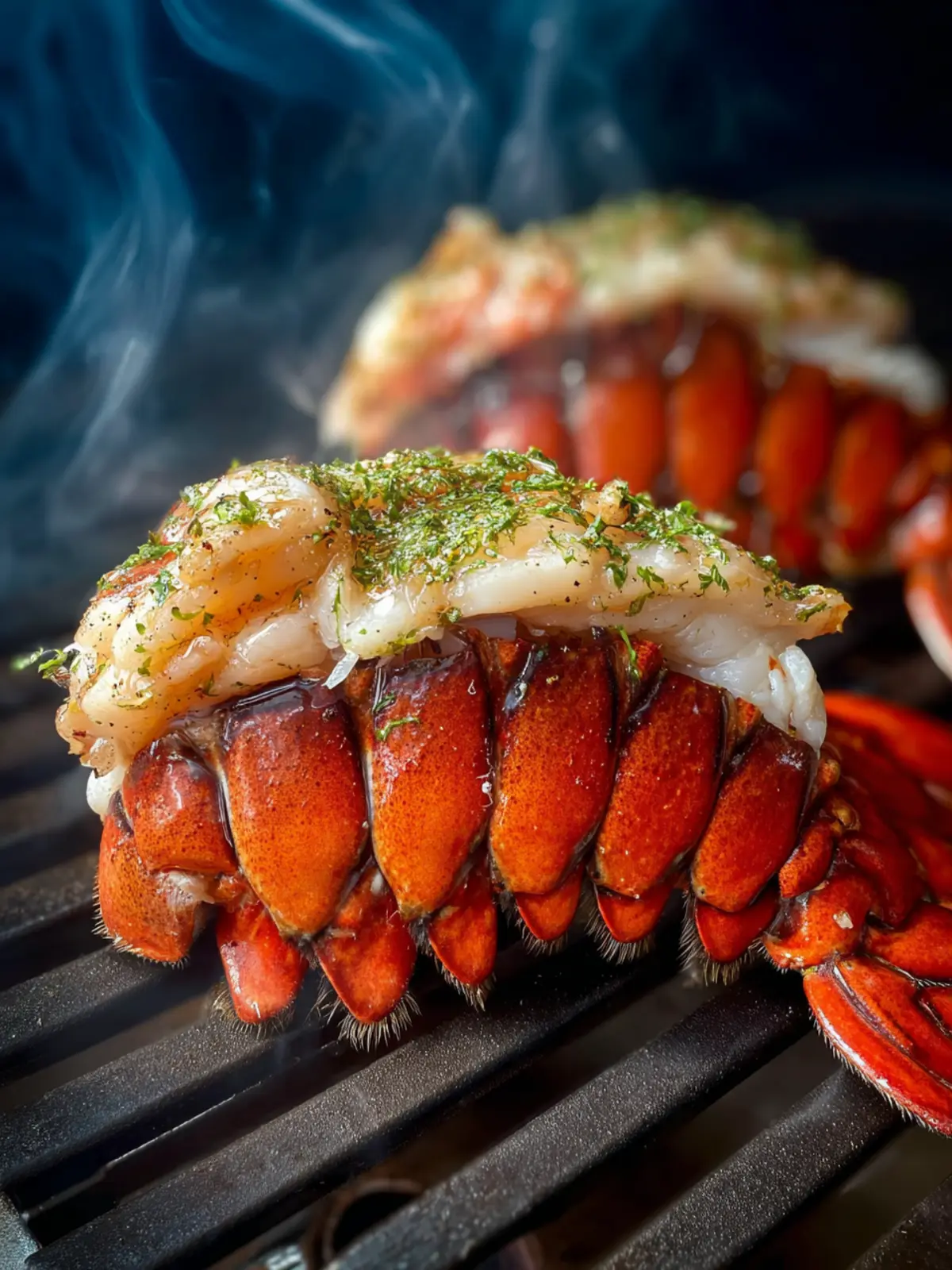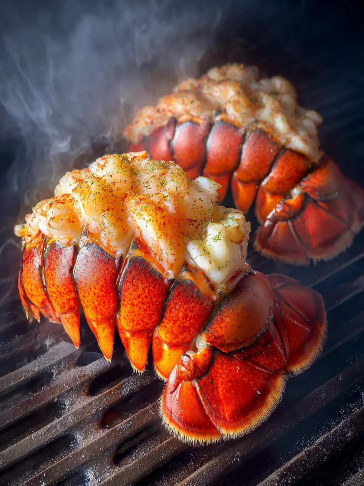 Smoked lobster tails with garlic butter, lemon juice, and Old Bay seasoning, perfect for a seafood treat.